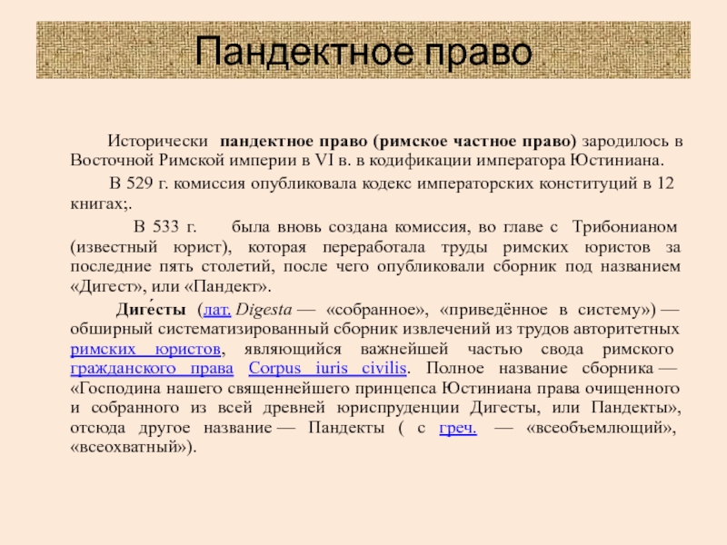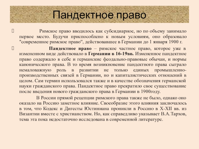 Пандектное право – римское частное право, которое уже в измененном виде действовало в Германии в 16-19вв. Измененное пандектное право содержало в себе и германские феодально-правовые обычаи, и нормы канонического права. В то время возникновение пандектного права сыграло немаловажную роль в развитии не только единых промышленно-производственных связей в Германии, но и капиталистических отношений в целом. Сам термин использовался также и в качестве обозначения германской науки гражданского права. Пандектное право прекратило свое существование после введения нового гражданского права в Германии в 1900году.