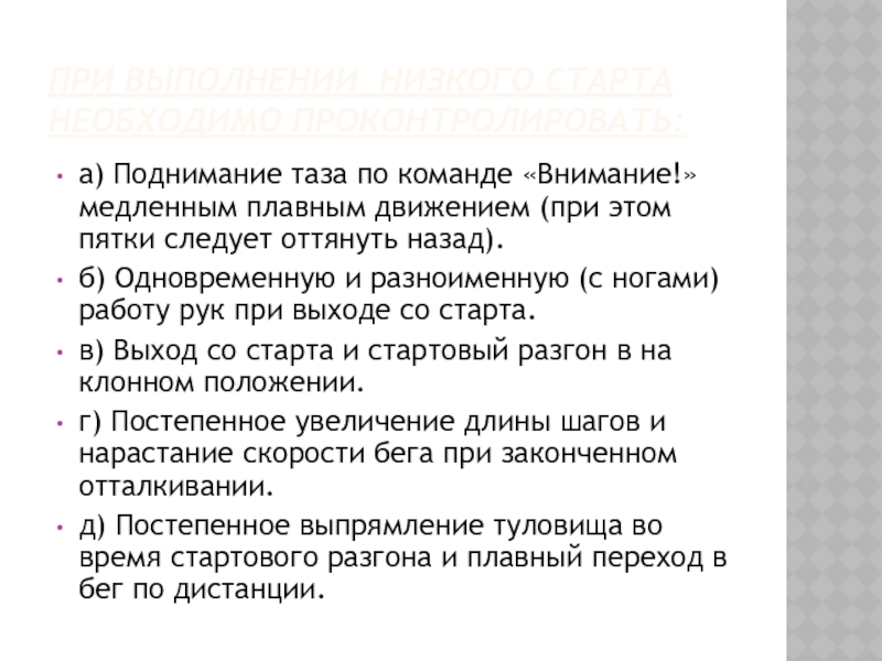 ПРИ ВЫПОЛНЕНИИ НИЗКОГО СТАРТА НЕОБХОДИМО ПРОКОНТРОЛИРО­ВАТЬ:а) Поднимание таза по команде «Внимание!» медленным плавным движением (при этом пятки