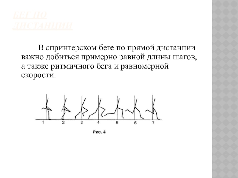 БЕГ ПО ДИСТАНЦИИ		В спринтерском беге по прямой дистанции важно добиться примерно равной длины шагов, а также ритмичного