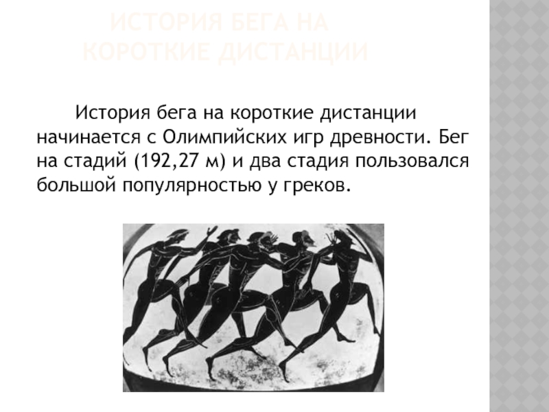 ИСТОРИЯ БЕГА НА КОРОТКИЕ ДИСТАНЦИИ 		История бега на короткие дистанции начинается с Олимпийских игр древности. Бег на