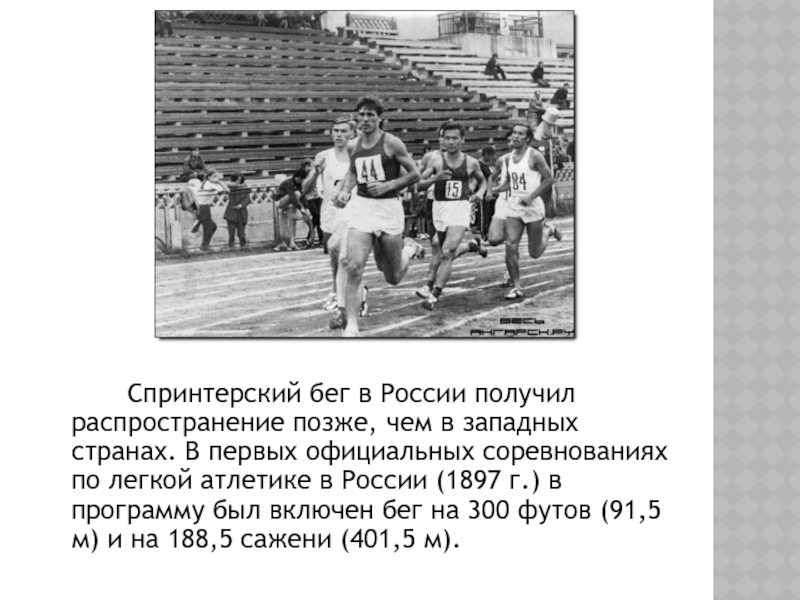 Слайд 4 Спринтерский бег в России получил распространение позже, чем в западных