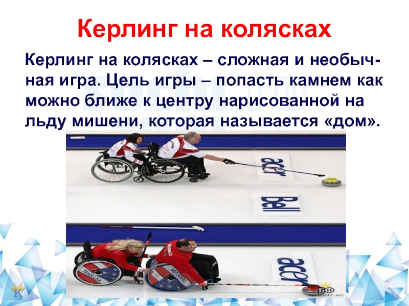Керлинг на колясках  Керлинг на колясках – сложная и необыч-ная игра. Цель игры – попасть
