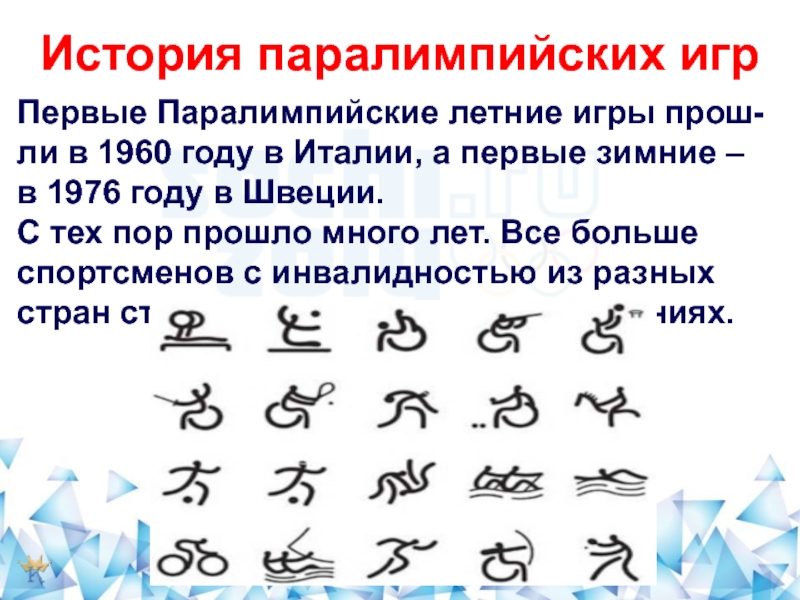 История паралимпийских игр Первые Паралимпийские летние игры прош-ли в 1960 году в Италии, а первые зимние