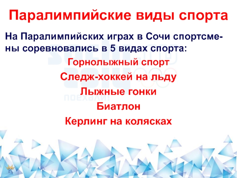 Паралимпийские виды спорта На Паралимпийских играх в Сочи спортсме-ны соревновались в 5 видах спорта:Горнолыжный спортСледж-хоккей на
