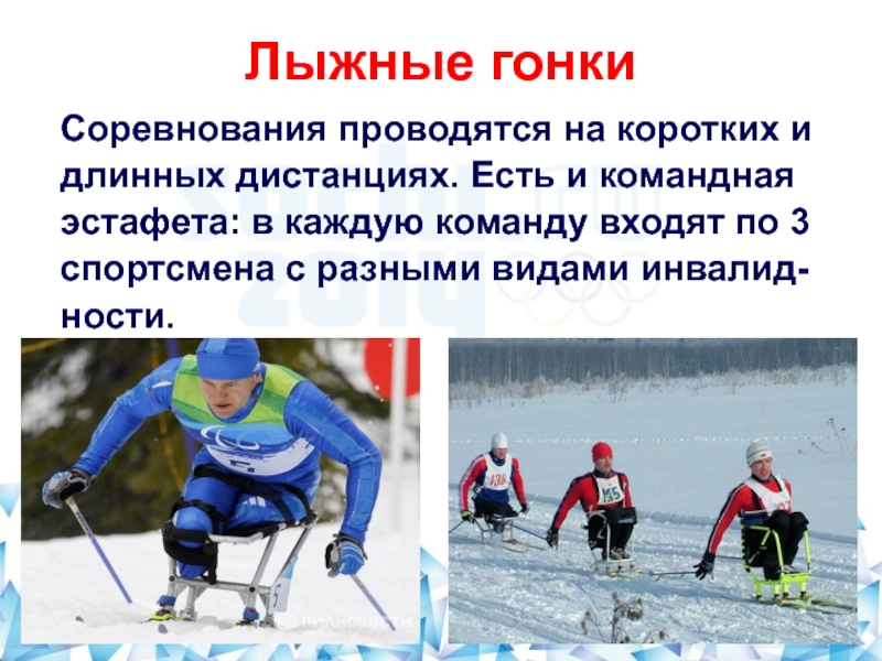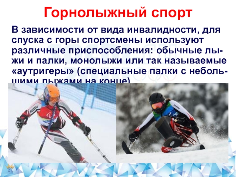 Горнолыжный спорт В зависимости от вида инвалидности, для спуска с горы спортсмены используют различные приспособления: обычные