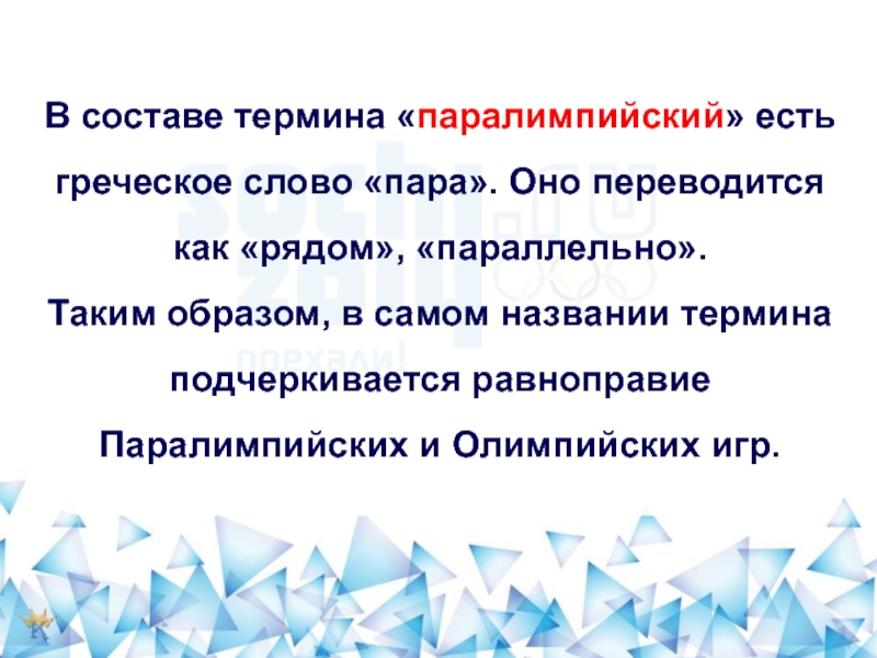 Слайд 7В составе термина «паралимпийский» есть греческое слово «пара». Оно переводится