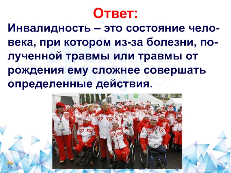 Инвалидность – это состояние чело-века, при котором из-за болезни, по-лученной травмы или травмы от рождения ему сложнее