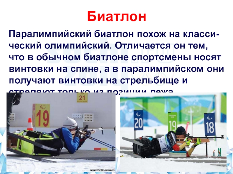 Биатлон Паралимпийский биатлон похож на класси-ческий олимпийский. Отличается он тем, что в обычном биатлоне спортсмены носят