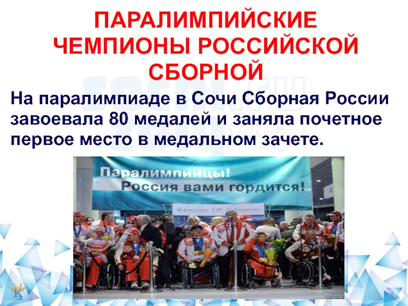 ПАРАЛИМПИЙСКИЕ ЧЕМПИОНЫ РОССИЙСКОЙ СБОРНОЙНа паралимпиаде в Сочи Сборная России завоевала 80 медалей и заняла почетное первое место