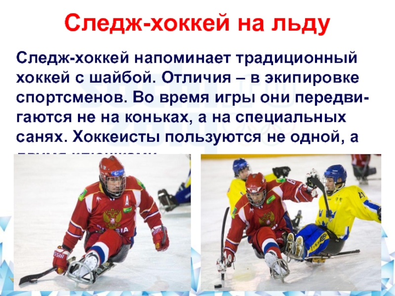 Следж-хоккей на льду Следж-хоккей напоминает традиционный хоккей с шайбой. Отличия – в экипировке спортсменов. Во время