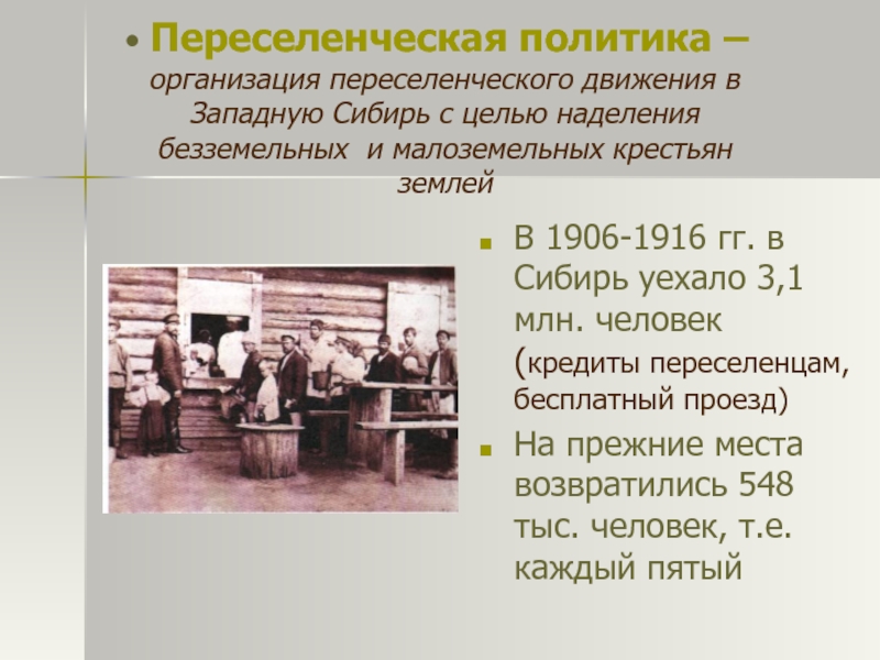 Переселенческая политика – организация переселенческого движения в Западную Сибирь с целью наделения безземельных и малоземельных крестьян землей