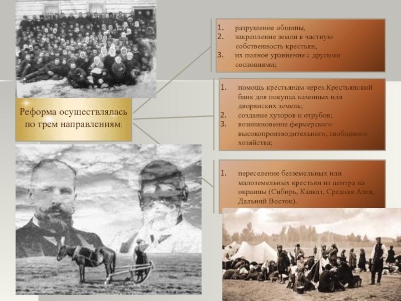переселение безземельных или малоземельных крестьян из центра на окраины (Сибирь, Кавказ, Средняя Азия, Дальний Восток).