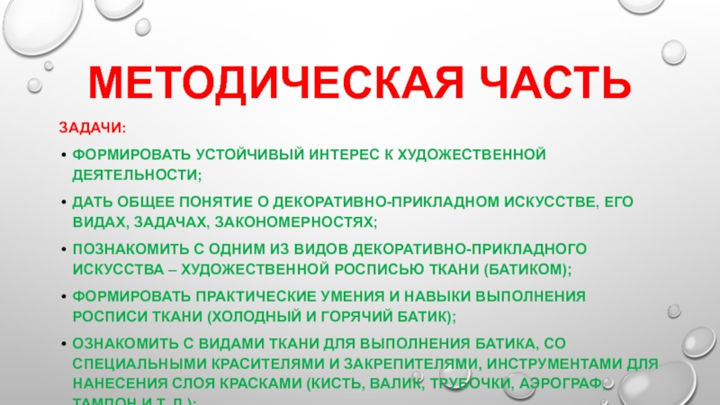 ознакомить с видами ткани для выполнения батика, со специальными красителями и закрепителями, инструментами для нанесения слоя красками (кисть, валик, трубочки, аэрограф, тампон и т. д.);