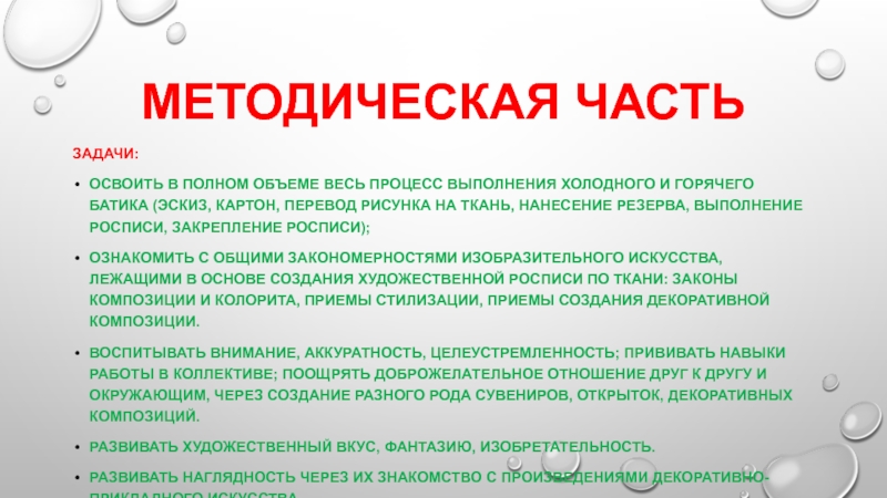 формировать практические умения и навыки выполнения росписи ткани (холодный и горячий батик);