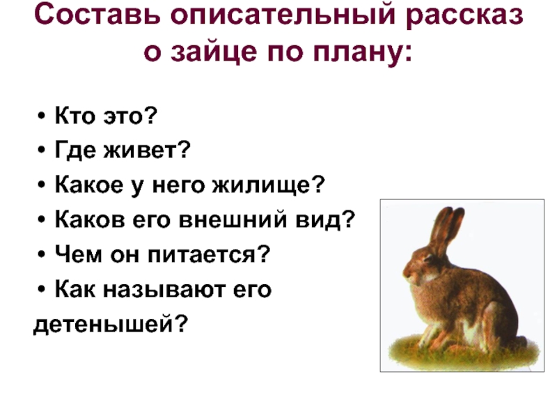 Слайд 24Составь описательный рассказ о зайце по плану:
