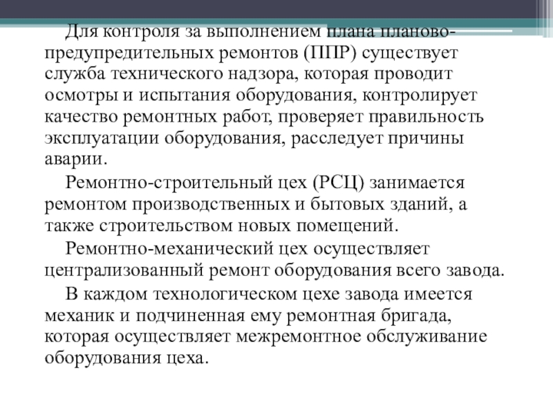 Слайд 8Для контроля за выполнением плана планово-предупредительных ремонтов (ППР) существует служба
