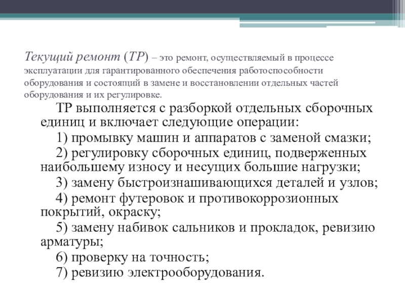 Слайд 12Текущий ремонт (ТР) – это ремонт, осуществляемый в процессе эксплуатации