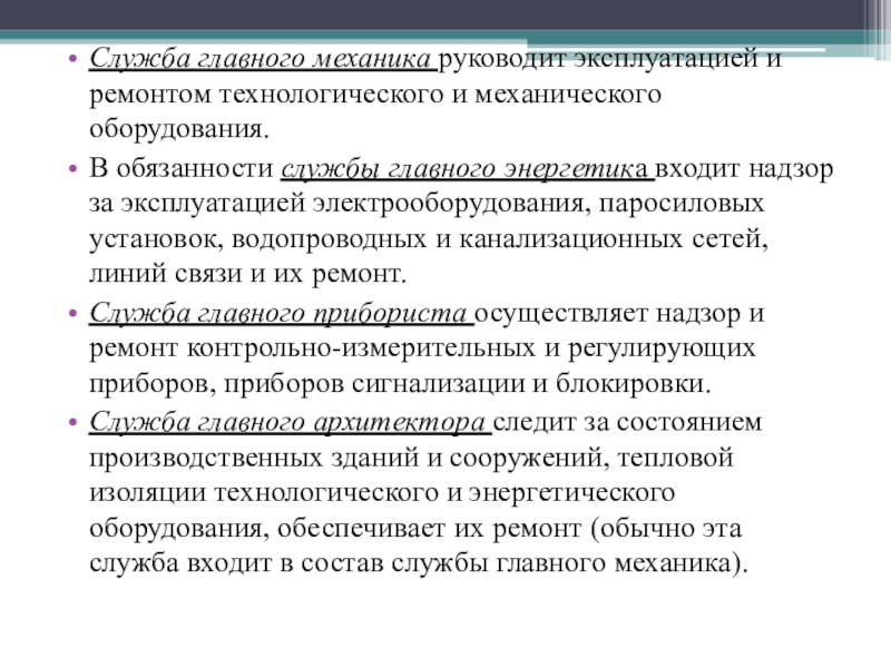 Слайд 5Служба главного механика руководит эксплуатацией и ремонтом технологического и механического
