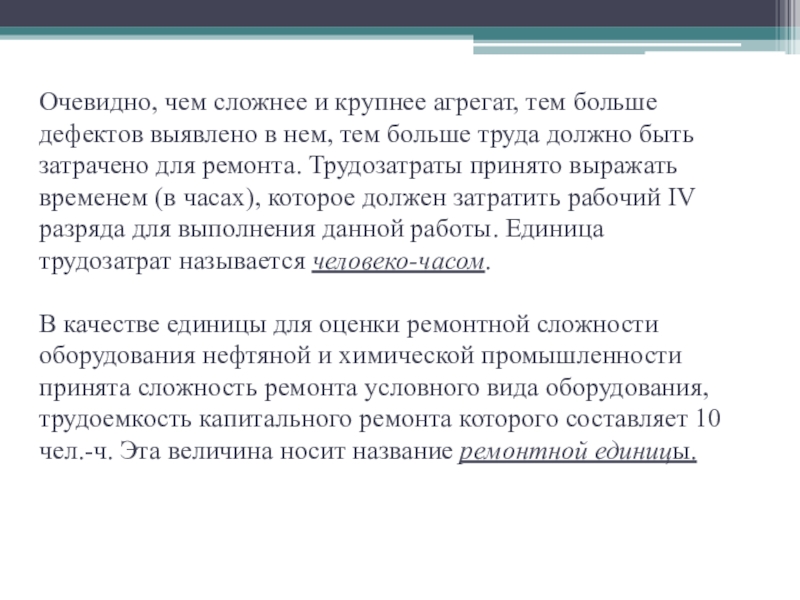 В качестве единицы для оценки ремонтной сложности оборудования нефтяной и химической промышленности принята сложность ремонта условного вида оборудования, трудоемкость капитального ремонта которого составляет 10 чел.-ч. Эта величина носит название ремонтной единицы.