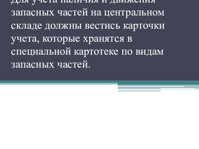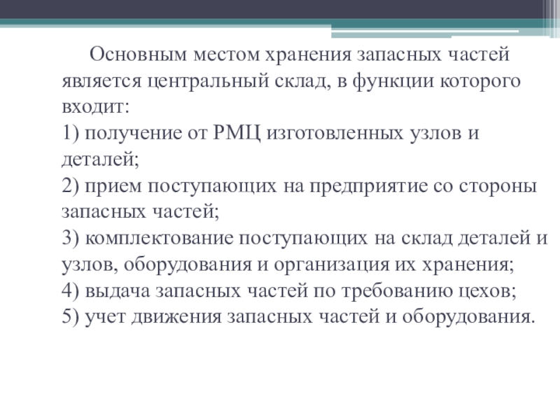 Слайд 23Основным местом хранения запасных частей является центральный склад, в функции