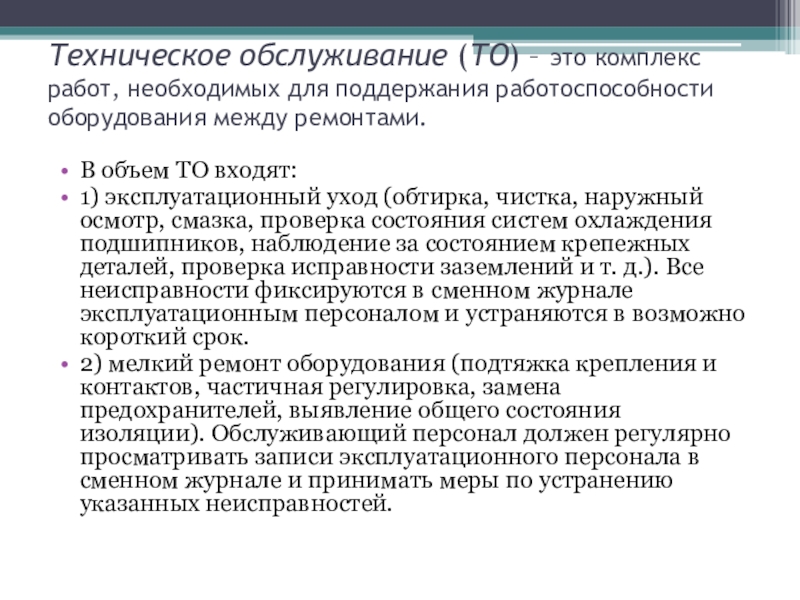 Слайд 11Техническое обслуживание (ТО) – это комплекс работ, необходимых для поддержания