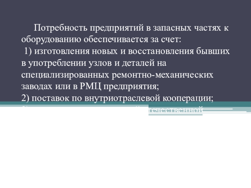 Слайд 22Потребность предприятий в запасных частях к оборудованию обеспечивается за счет: