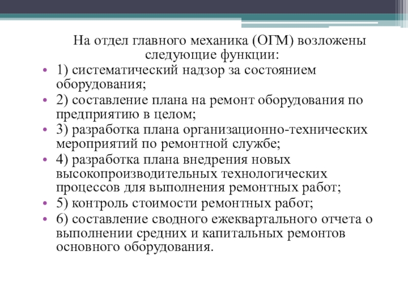 На отдел главного механика (ОГМ) возложены следующие функции: