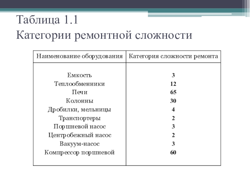 В табл. 1.1 приведены категории ремонтной сложности некоторых видов химического оборудования.