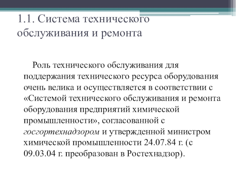 «Системой технического обслуживания и ремонта оборудования предприятий химической промышленности», согласованной с госгортехнадзором и утвержденной министром химической промышленности 24.07.84 г. (с 09.03.04 г. преобразован в Ростехнадзор).