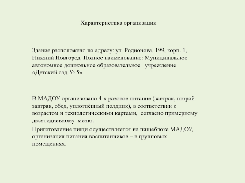 Характеристика организацииЗдание расположено по адресу: ул. Родионова, 199, корп. 1, Нижний Новгород. Полное наименование: Муниципальное автономное дошкольное
