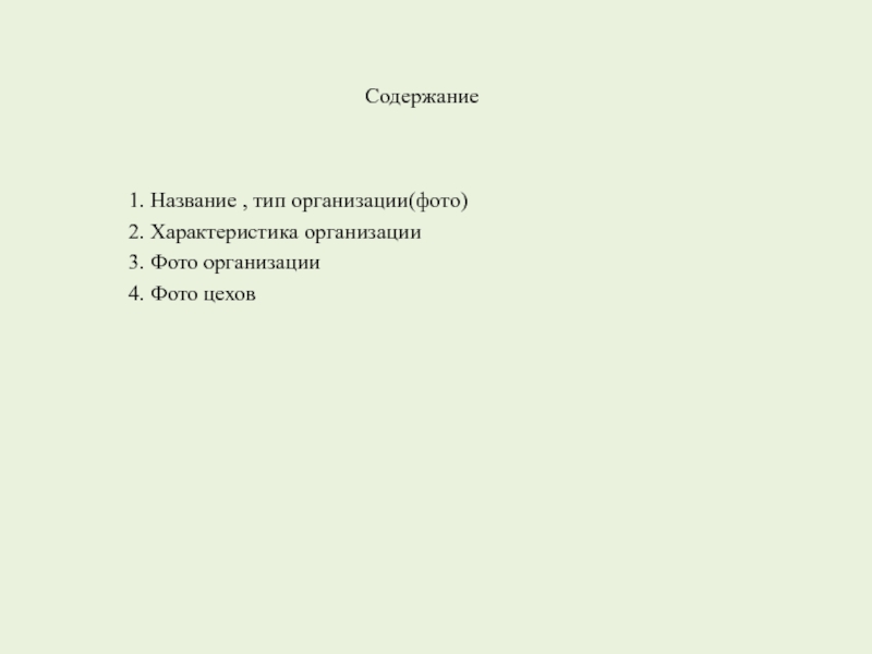 Содержание1. Название , тип организации(фото)2. Характеристика организации3. Фото организации 4. Фото цехов
