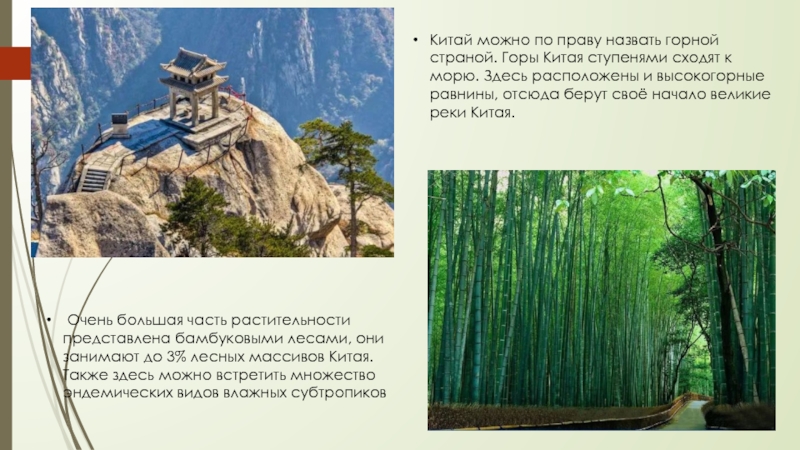 Очень большая часть растительности представлена бамбуковыми лесами, они занимают до 3% лесных массивов Китая. Также здесь можно встретить множество эндемических видов влажных субтропиков