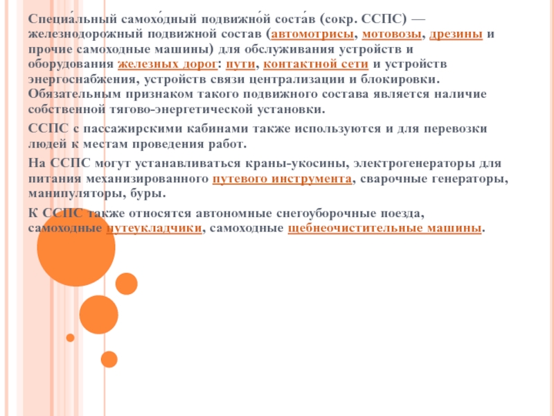 устройств связи централизации и блокировки. Обязательным признаком такого подвижного состава является наличие собственной тягово-энергетической установки.ССПС с пассажирскими кабинами также используются и для перевозки людей к местам проведения работ.