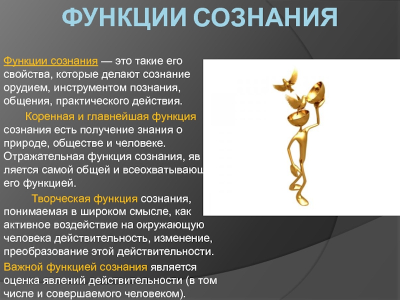 и главнейшая функция сознания есть получение знания о природе, обществе и человеке. Отражательная функция сознания, является самой общей и всеохватывающей его функцией.