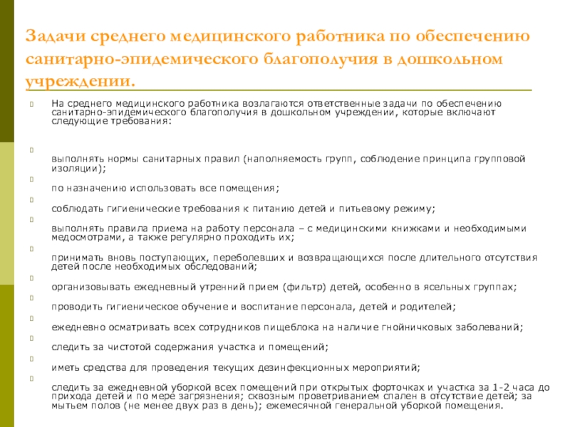 Слайд 5Задачи среднего медицинского работника по обеспечению санитарно-эпидемического благополучия в дошкольном