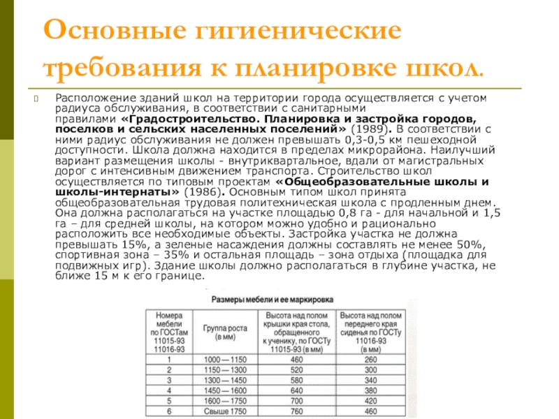 правилами «Градостроительство. Планировка и застройка городов, поселков и сельских населенных поселений» (1989). В соответствии с ними радиус обслуживания не должен превышать 0,3-0,5 км пешеходной доступности. Школа должна находится в пределах микрорайона. Наилучший вариант размещения школы - внутриквартальное, вдали от магистральных дорог с интенсивным движением транспорта. Строительство школ осуществляется по типовым проектам «Общеобразовательные школы и школы-интернаты» (1986). Основным типом школ принята общеобразовательная трудовая политехническая школа с продленным днем. Она должна располагаться на участке площадью 0,8 га - для начальной и 1,5 га – для средней школы, на котором можно удобно и рационально расположить все необходимые объекты. Застройка участка не должна превышать 15%, а зеленые насаждения должны составлять не менее 50%, спортивная зона – 35% и остальная площадь – зона отдыха (площадка для подвижных игр). Здание школы должно располагаться в глубине участка, не ближе 15 м к его границе.