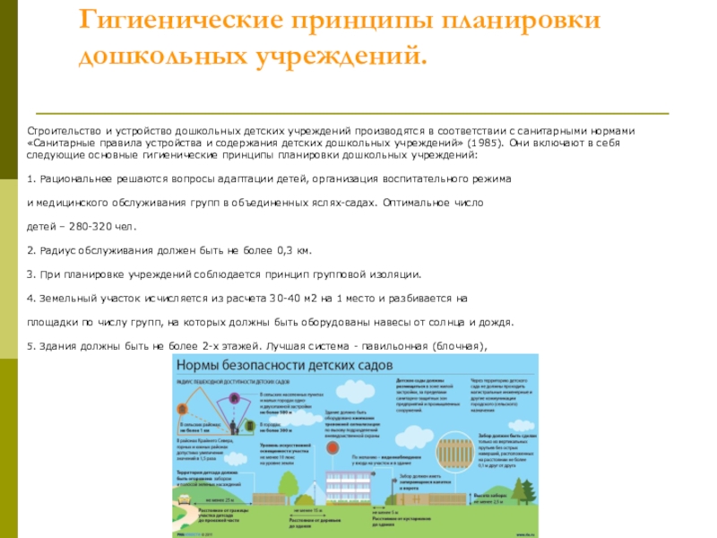 содержания детских дошкольных учреждений» (1985). Они включают в себя следующие основные гигиенические принципы планировки дошкольных учреждений:
