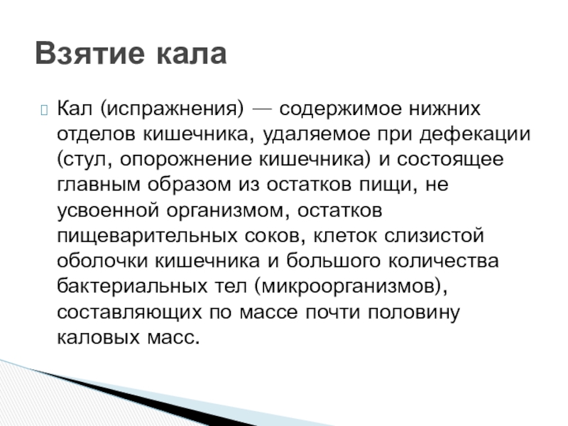Слайд 12Кал (испражнения) — содержимое нижних отделов кишечника, удаляемое при дефекации