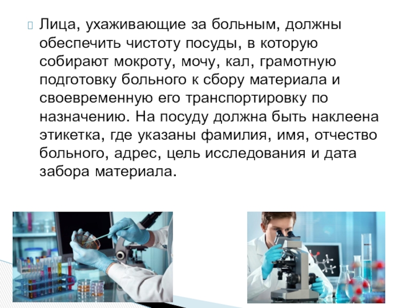 собирают мокроту, мочу, кал, грамотную подготовку больного к сбору материала