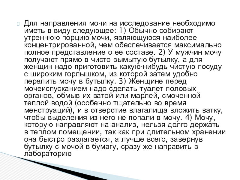 Слайд 10Для направления мочи на исследование необходимо иметь в виду следующее: