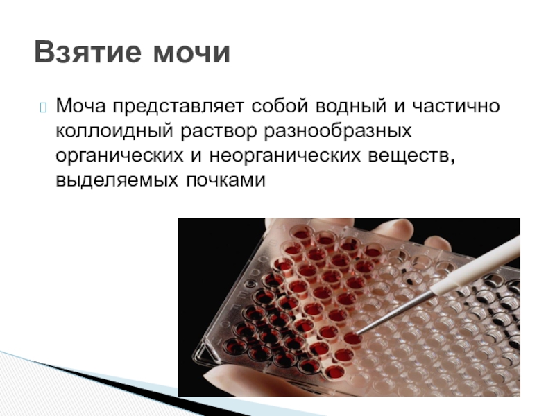 Слайд 7Моча представляет собой водный и частично коллоидный раствор разнообразных органических
