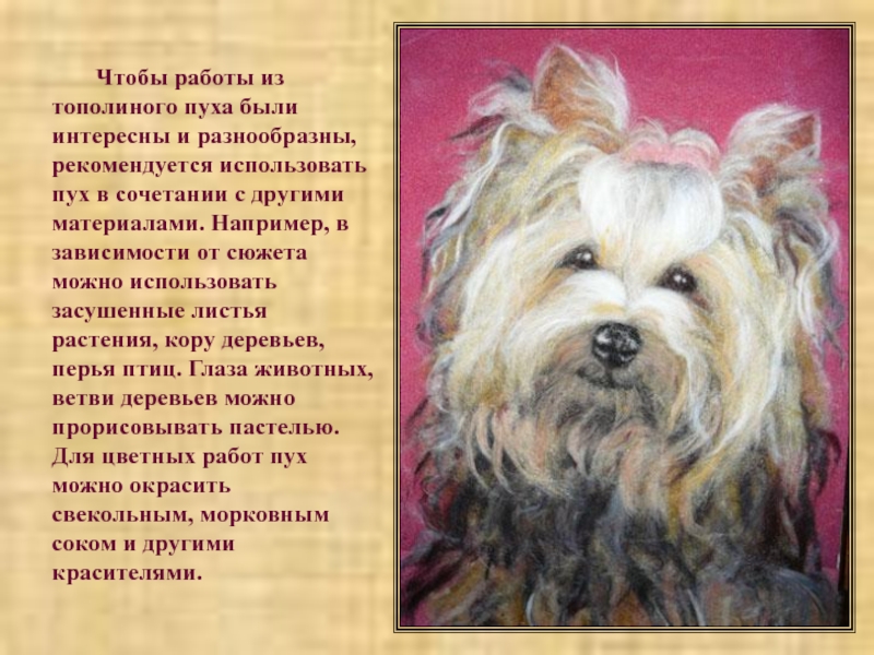 Можно использовать ивовый пух и пух кипрея или хлопка. Ивовый пух хорош тем, что он имеет особенный блеск, а пух кипрея - самый длинный. Он подойдёт для изображений длинношерстных пород животных или для их длинных усиков.