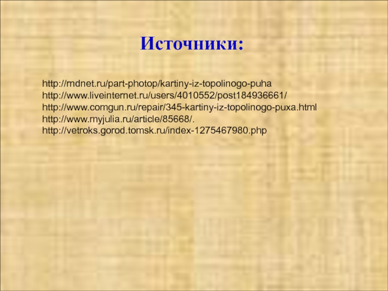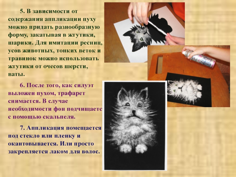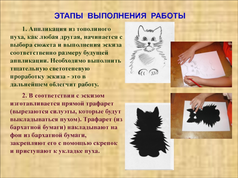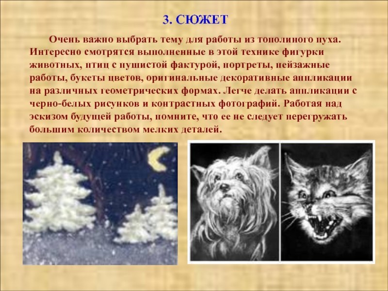 Очень важно выбрать тему для работы из тополиного пуха. Интересно смотрятся выполненные в этой технике фигурки животных, птиц с пушистой фактурой, портреты, пейзажные работы, букеты цветов, оригинальные декоративные аппликации на различных геометрических формах. Легче делать аппликации с черно-белых рисунков и контрастных фотографий. Работая над эскизом будущей работы, помните, что ее не следует перегружать большим количеством мелких деталей.