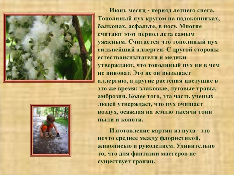 Июнь месяц - период летнего снега. Тополиный пух кругом на подоконниках, балконах, асфальте, в носу. Многие считают этот период лета самым ужасным. Считается что тополиный пух сильнейший аллерген. С другой стороны естествоиспытатели и медики утверждают, что тополиный пух ни в чем не виноват. Это не он вызывает аллергию, а другие растения цветущие в это же время: злаковые, луговые травы, амброзия. Более того, эта часть ученых людей утверждает, что пух очищает воздух, осаждая на землю тысячи тонн пыли и копоти.