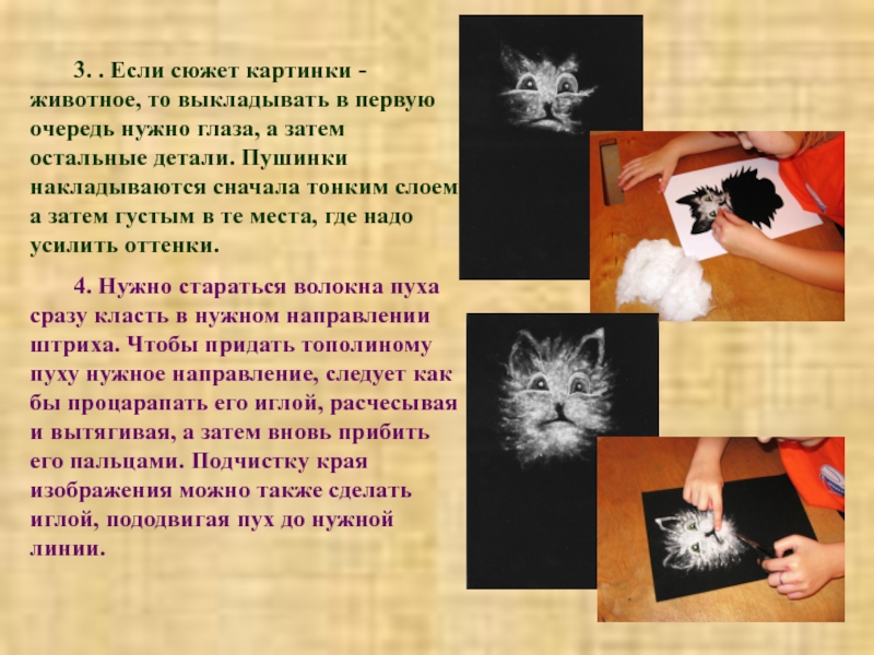 3. . Если сюжет картинки - животное, то выкладывать в первую очередь нужно глаза, а затем остальные детали. Пушинки накладываются сначала тонким слоем, а затем густым в те места, где надо усилить оттенки.