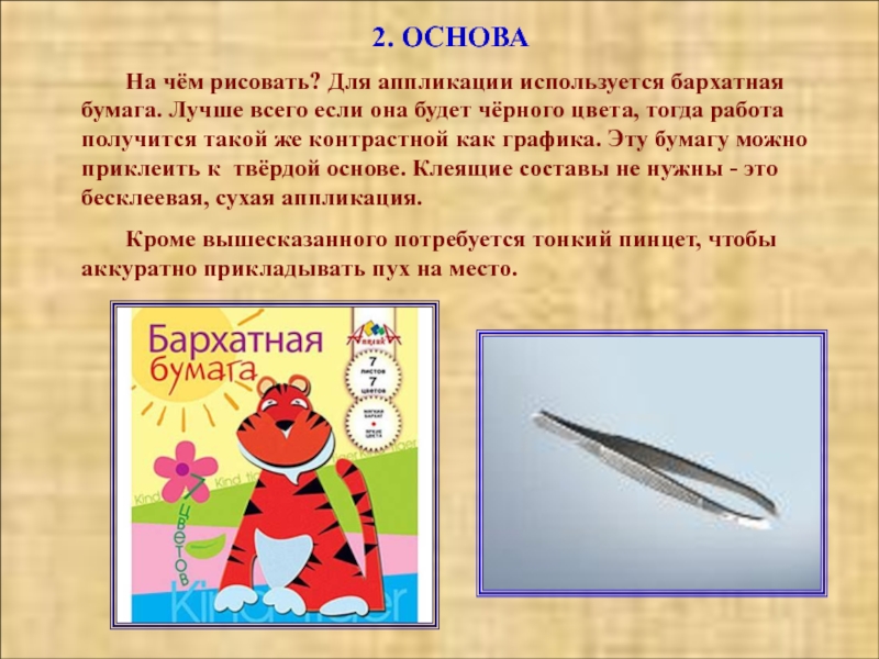 На чём рисовать? Для аппликации используется бархатная бумага. Лучше всего если она будет чёрного цвета, тогда работа получится такой же контрастной как графика. Эту бумагу можно приклеить к твёрдой основе. Клеящие составы не нужны - это бесклеевая, сухая аппликация.