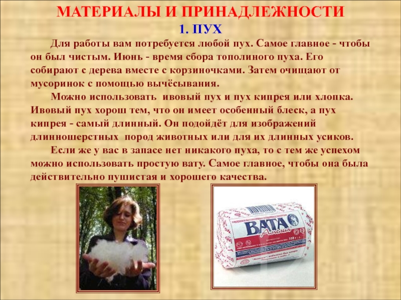 Для работы вам потребуется любой пух. Самое главное - чтобы он был чистым. Июнь - время сбора тополиного пуха. Его собирают с дерева вместе с корзиночками. Затем очищают от мусоринок с помощью вычёсывания.