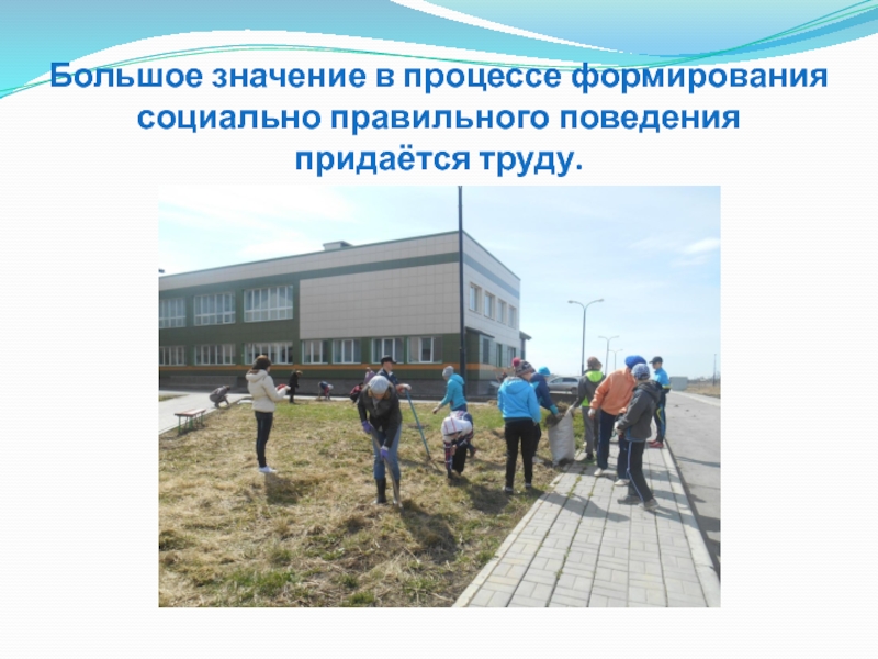 Слайд 9Большое значение в процессе формирования социально правильного поведения придаётся труду.
