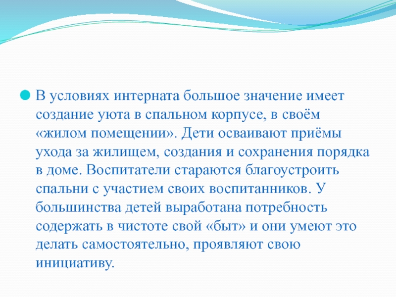 Слайд 5В условиях интерната большое значение имеет создание уюта в спальном