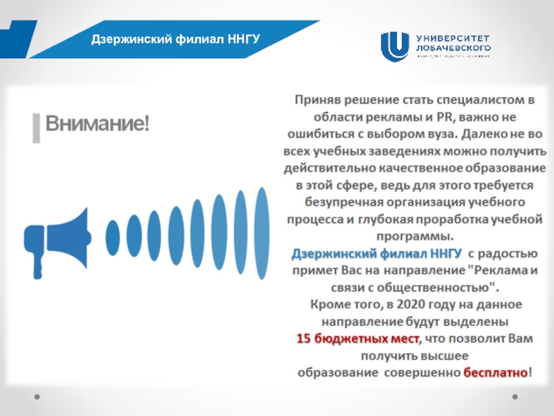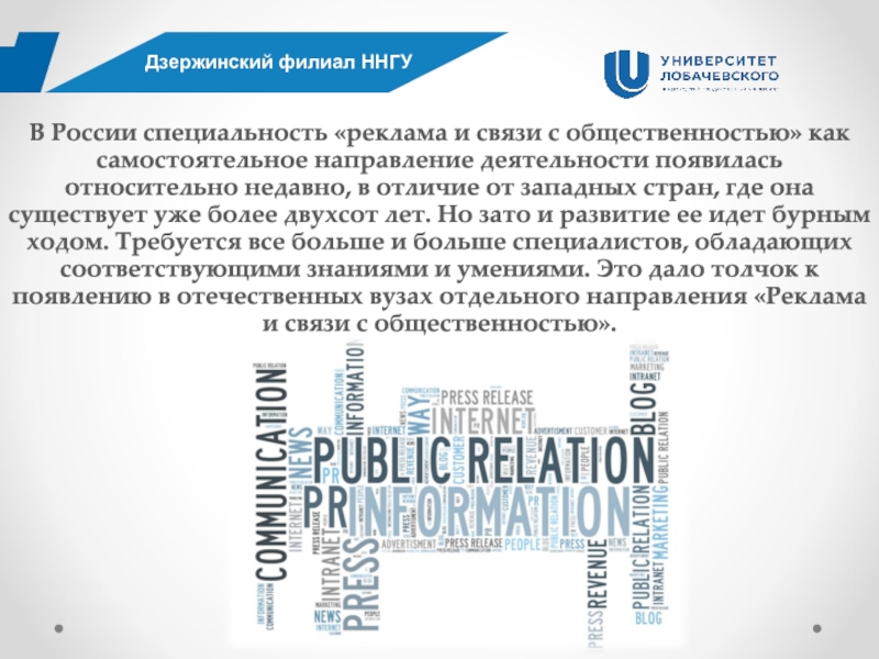 Дзержинский филиал ННГУВ России специальность «реклама и связи с общественностью» как самостоятельное направление деятельности появилась относительно недавно, в отличие от западных стран, где она существует уже более двухсот лет. Но